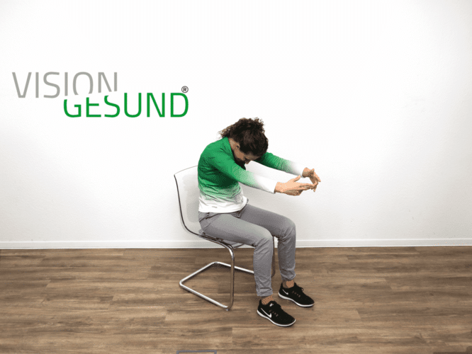 Rundrücken: Hände verschränken und gestreckte Arme vom Körper wegdrücken, dabei die Schulterblätter auseinanderziehen und Kinn auf die Brust nehmen – ausatmen während der Bewegung